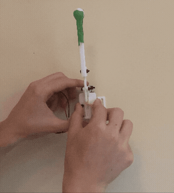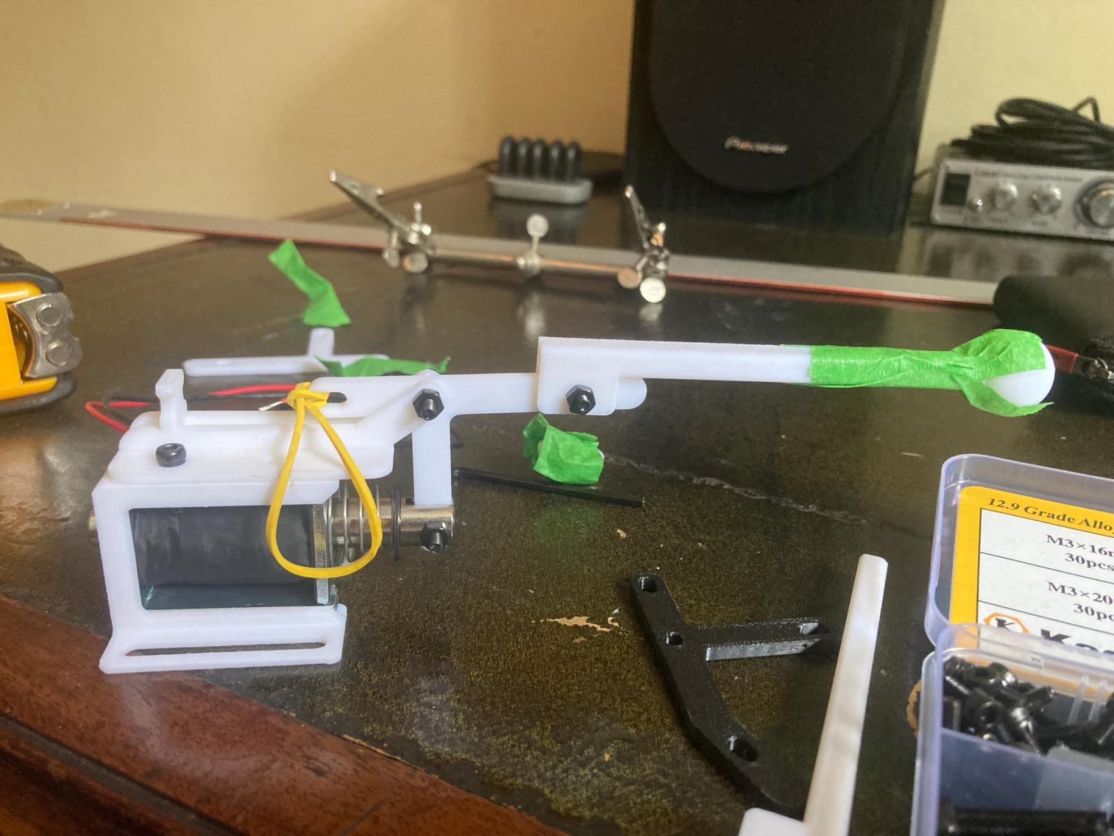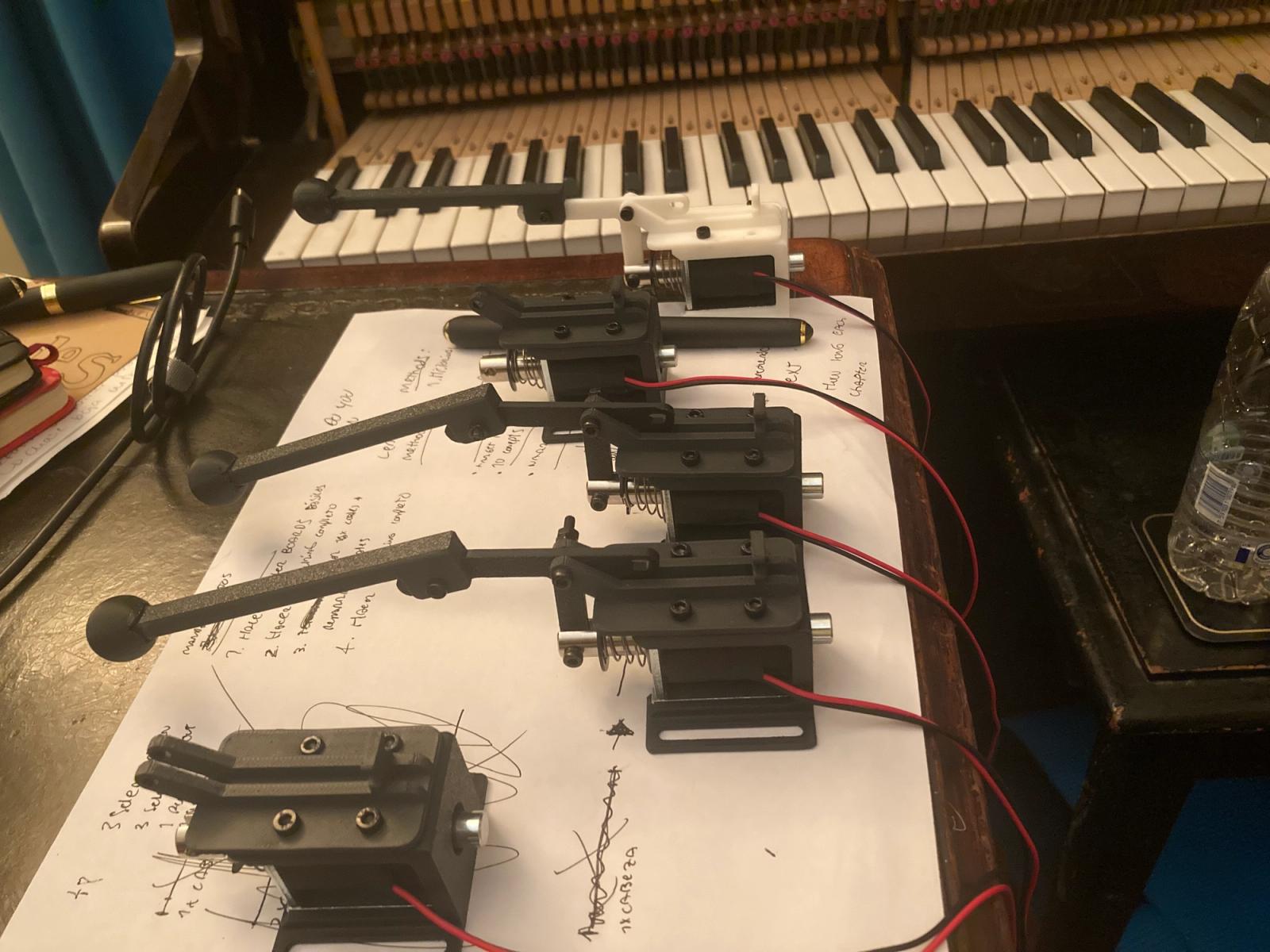 A series of 3D-printed parts were used to house the solenoid and convert it to a percussive instrument, based on a previous open source design. New design added a stronger wall mounting mechanism and simplified the percussive end of the solenoid.