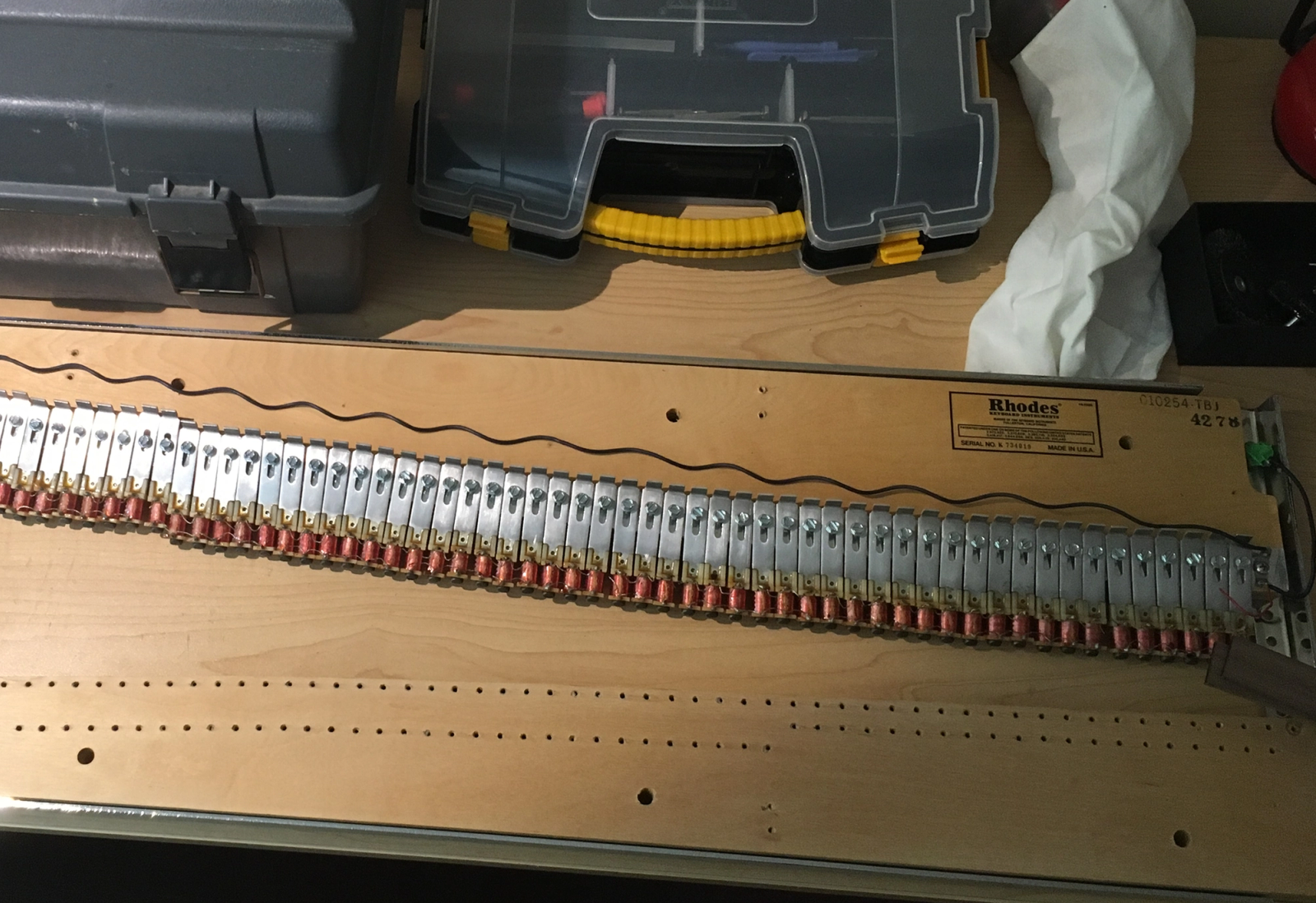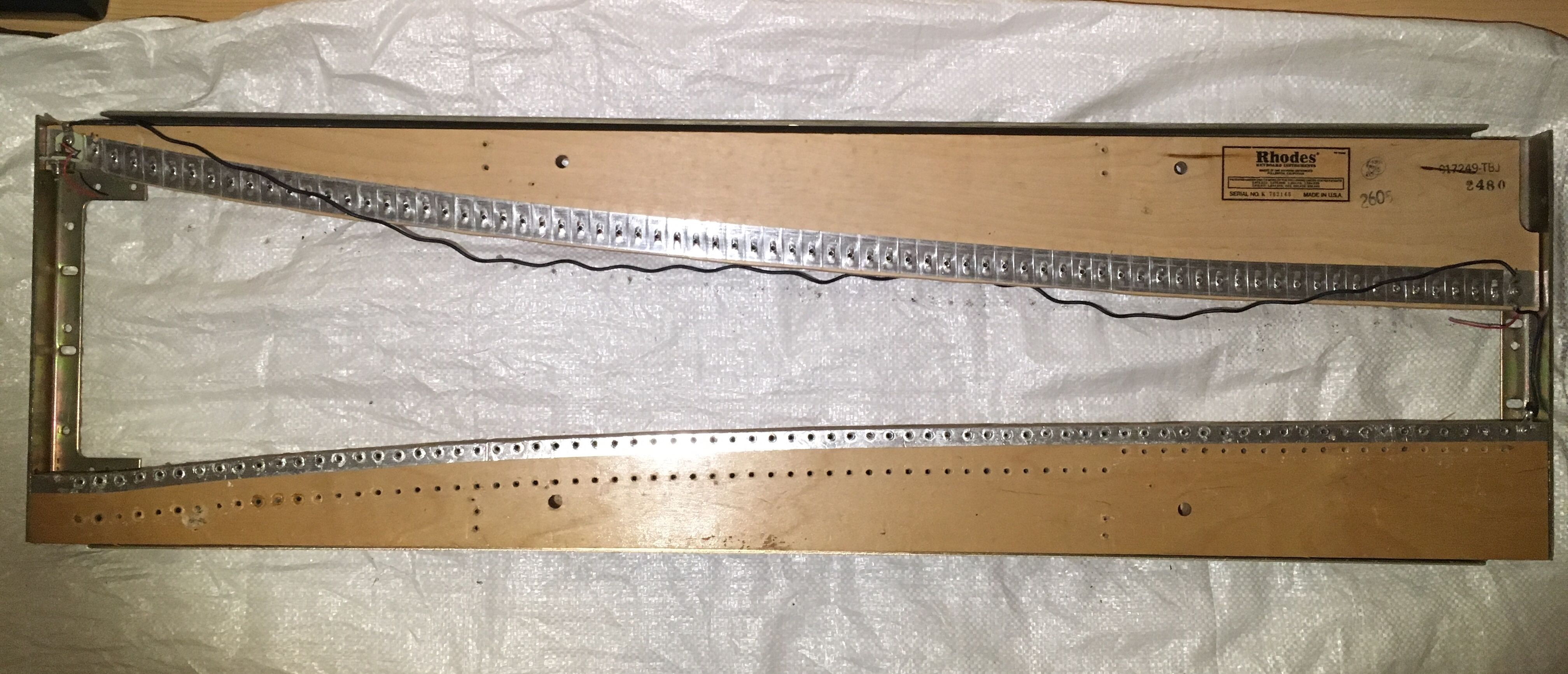 The harp frame itself was chromed, the wood pieces were restored and cleaned while preserving the original Rhodes serial number mark. New conductive shielding added on as well.