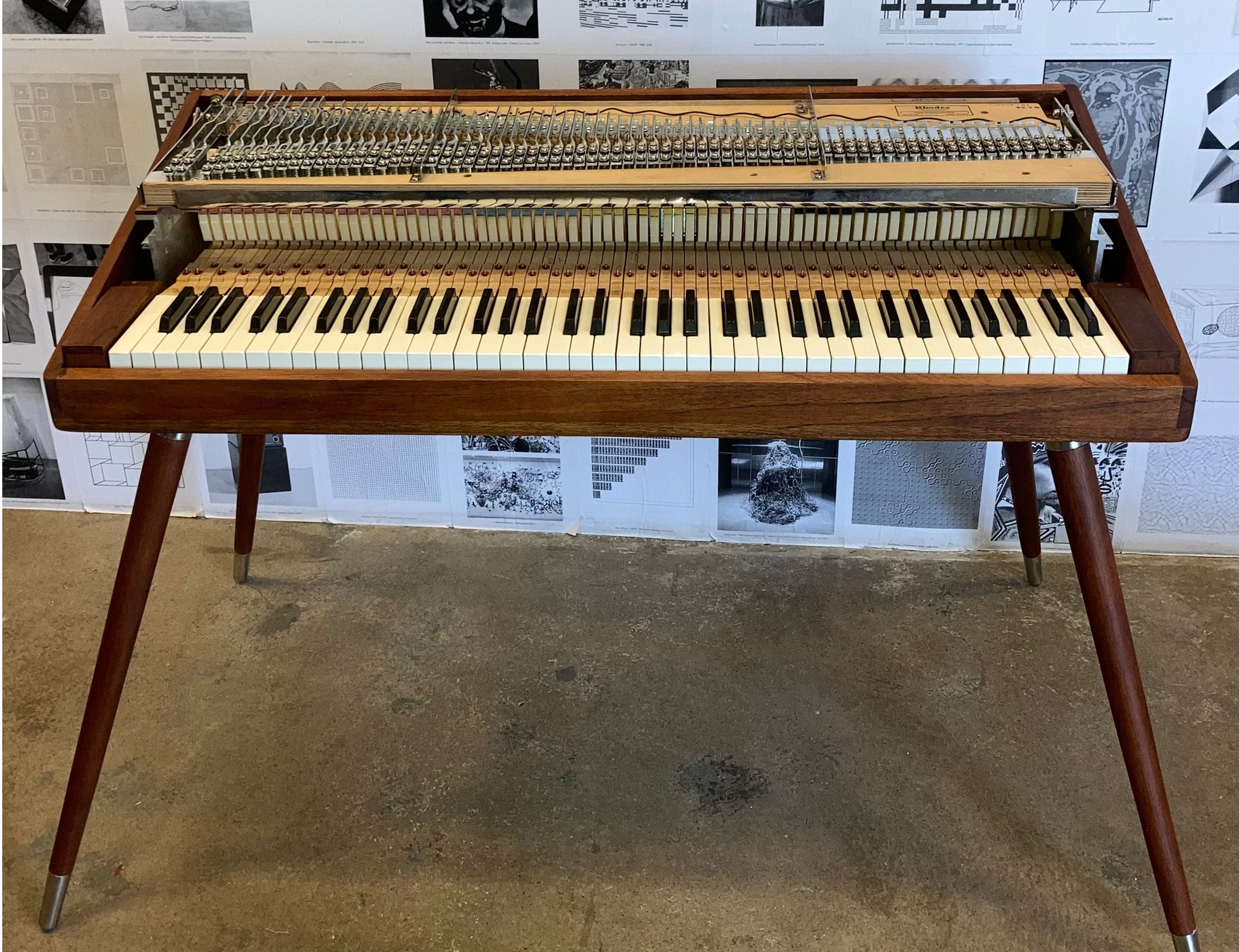 Beyond a full renovation and restoration of the keys action and sound, the piano was fully redesigned through a new cedar wood case, a new chromed mirror-like front rail plus a freshly painted white lid.