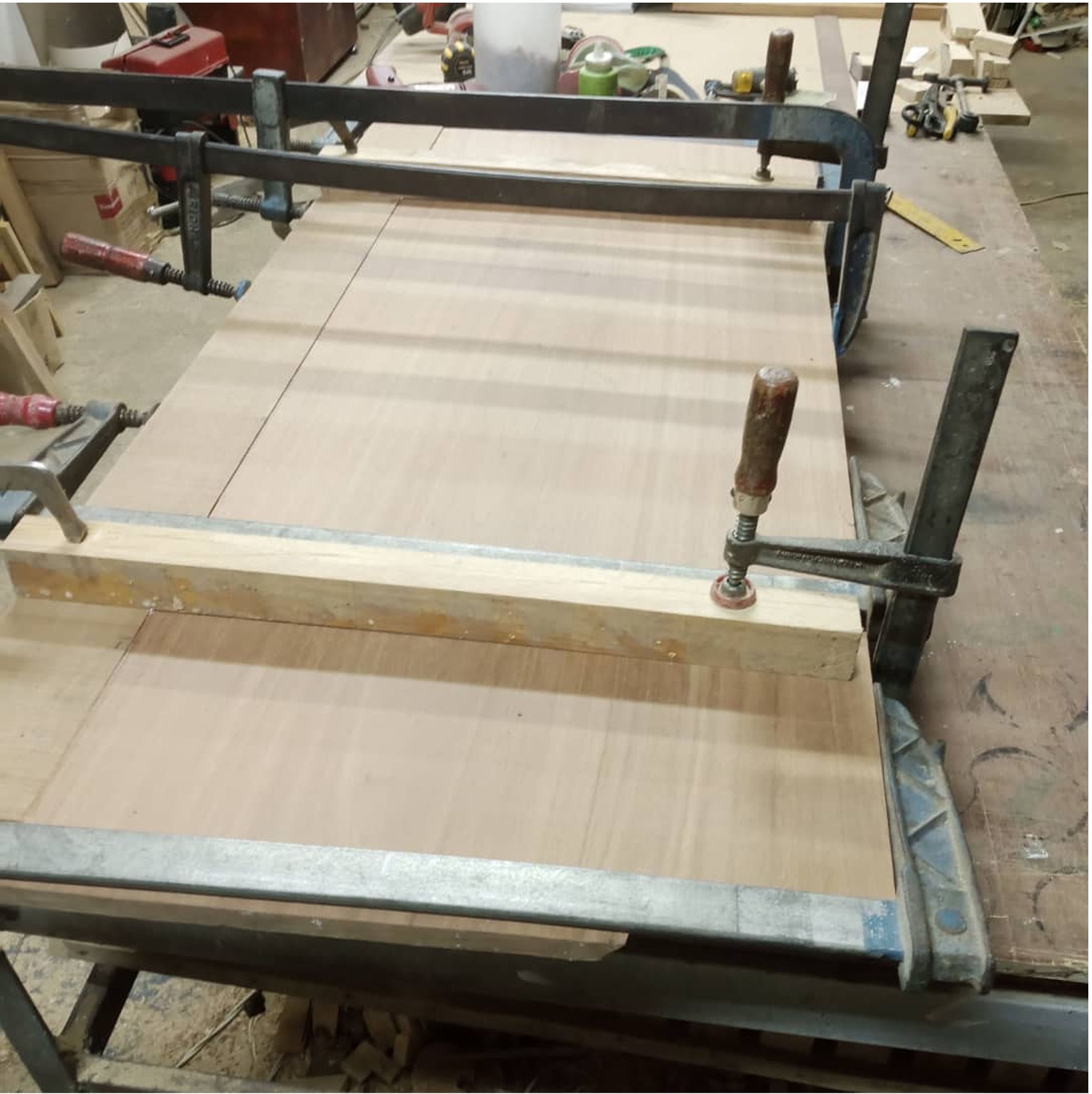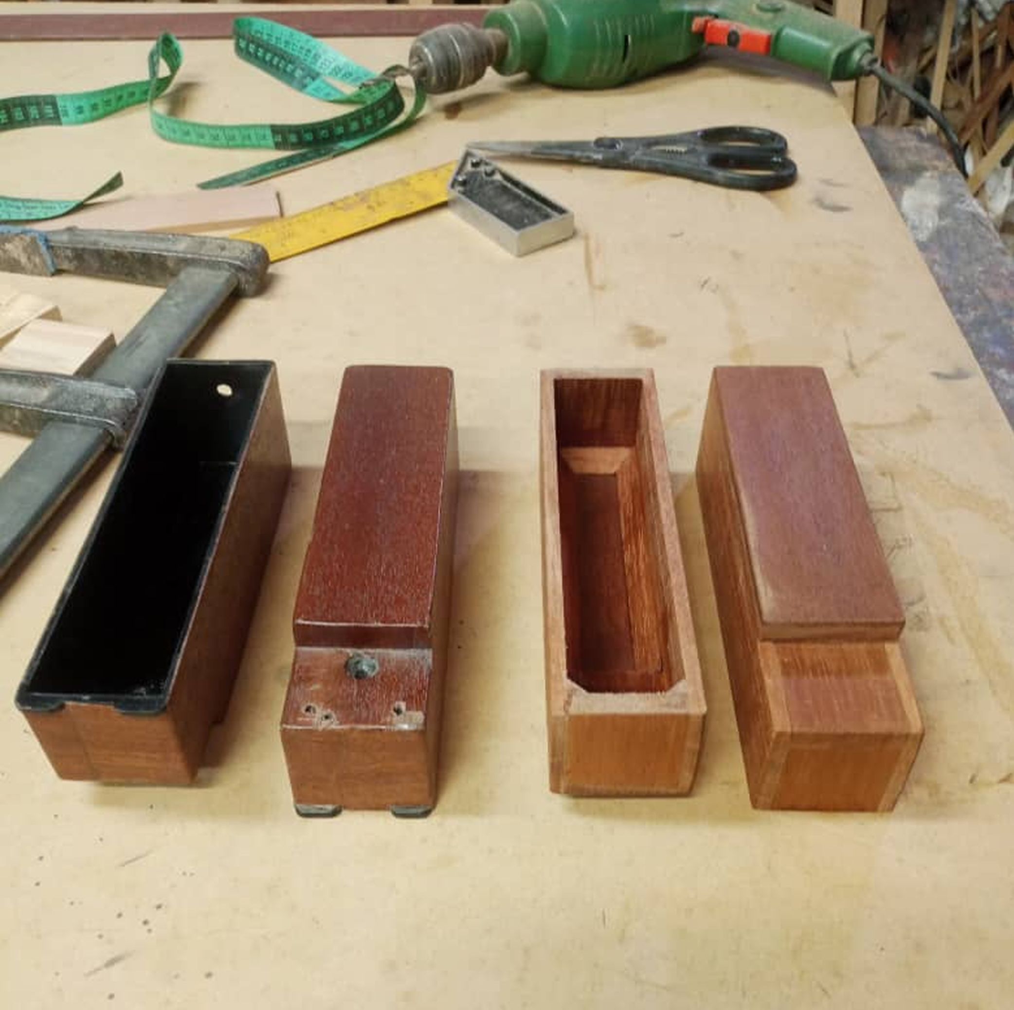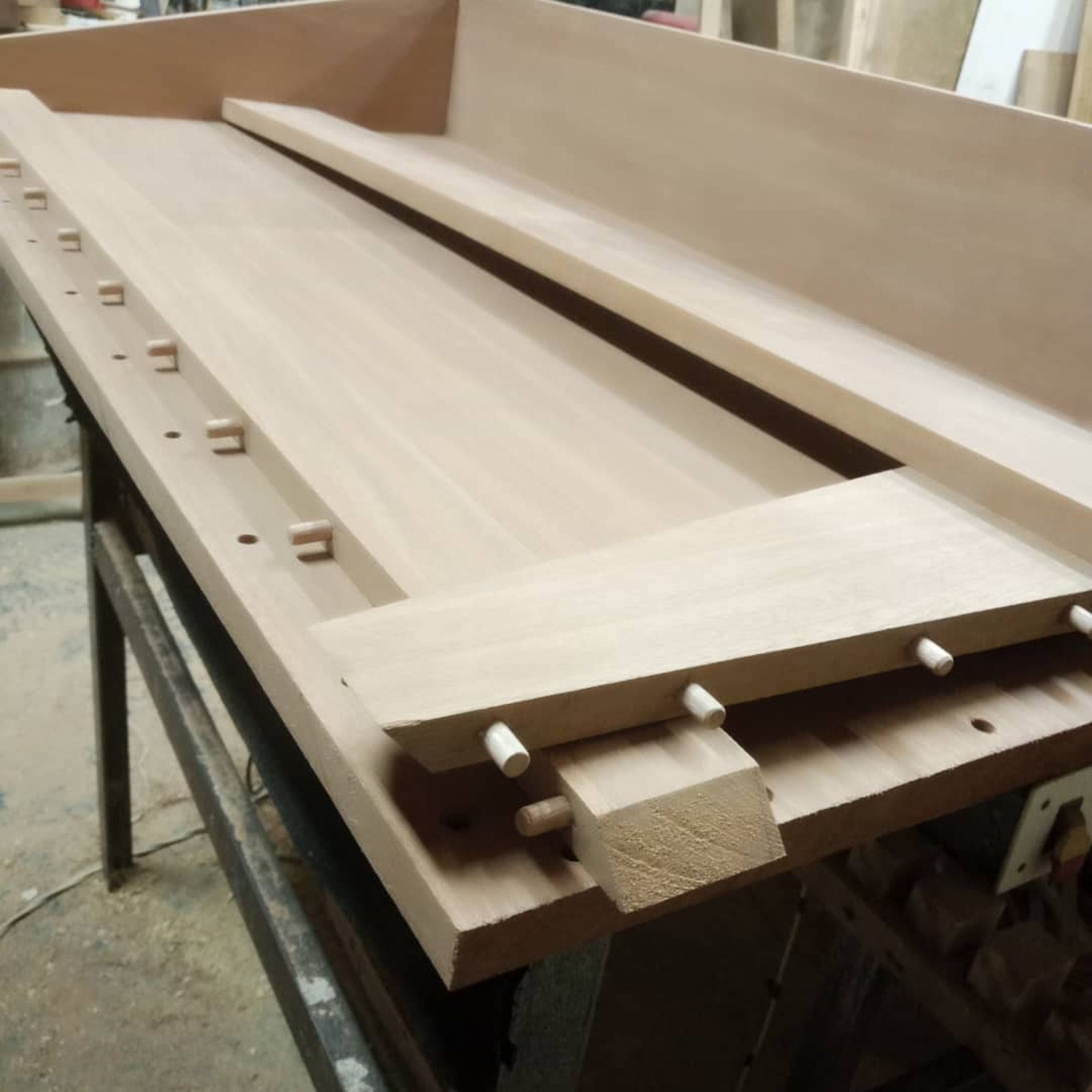 New cedar wood case and cheek blocks fully assembled and tinted with special beeswax. Finding the right wood took approximately a year, including many attempts of wood finishing and preservation tints. At the end, cedar was chosen due to its acoustic properties and beautiful ramifications.