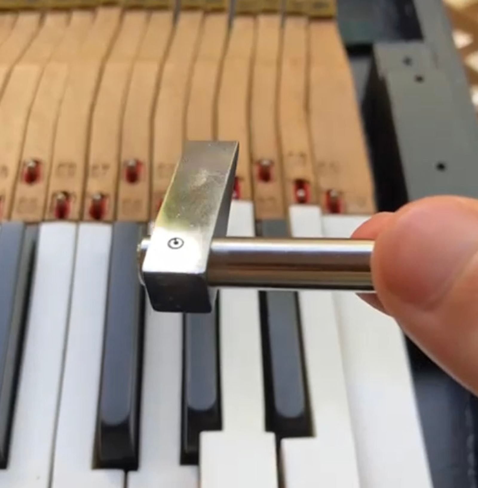 As seen in the image, the piano had many beaten and worn out hammer tips. These were all renovated using new hammer tips with the same original material consistency.