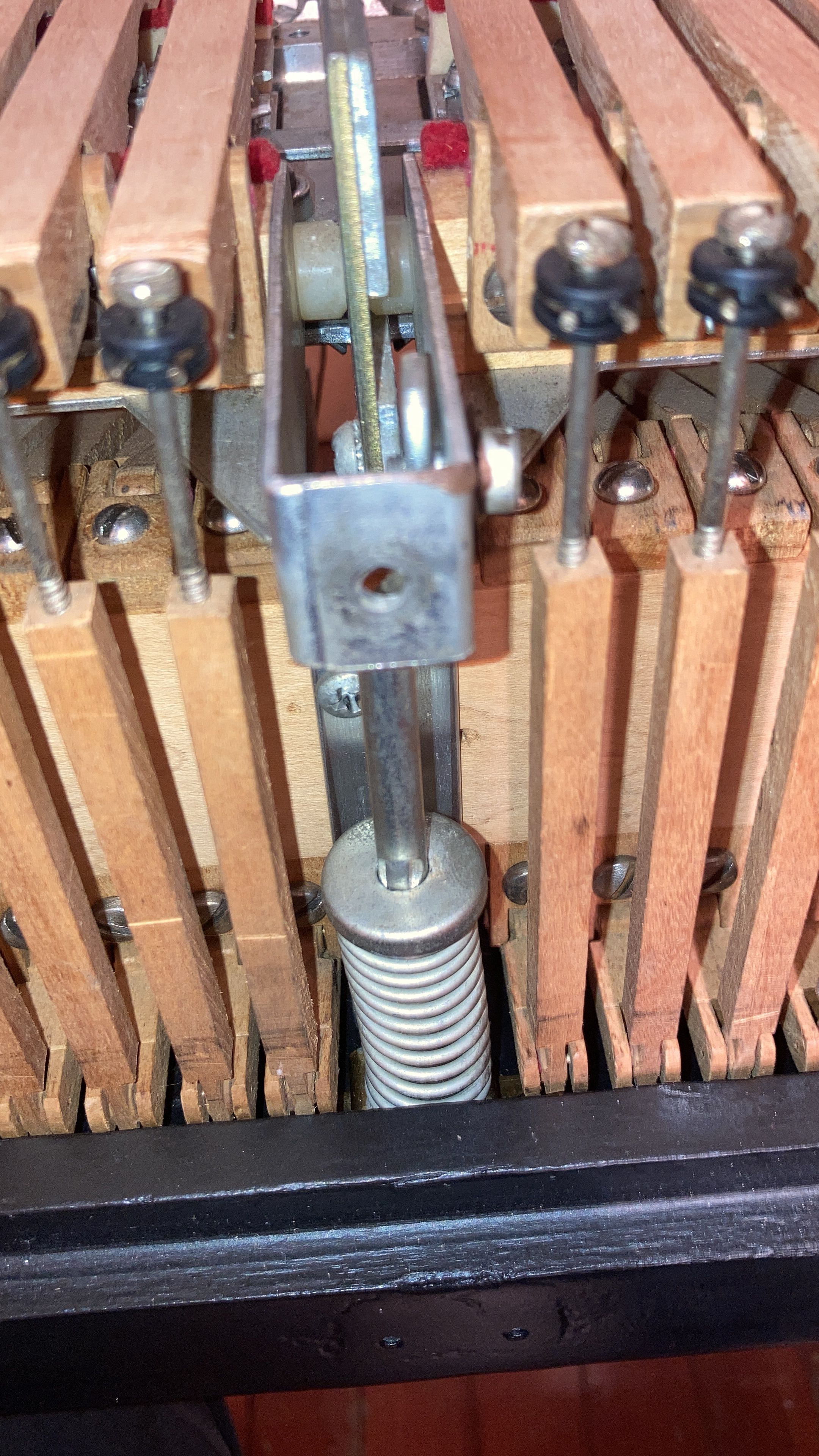 The original damper mechanism was rusty, slow and dirty. It was renewed using a new set of grommets and restored carefully regulating each note.