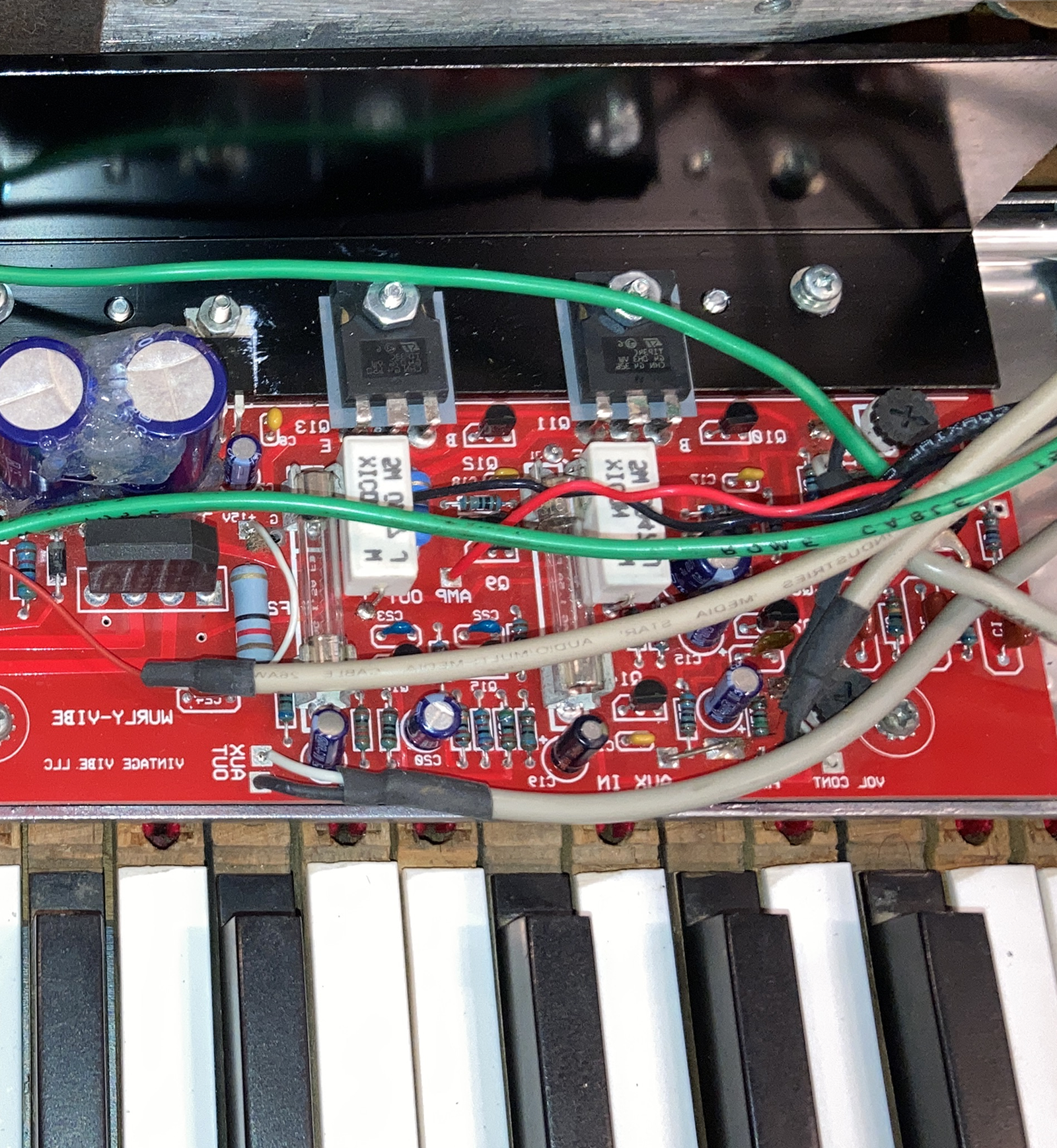 A new speaker and amplification system from vintage vibe was installed to replace the years of improvised electronics which held up the piano. The outcome is a much cleaner and powerful sound, loud enough to jam with a small band without compromising on the original wurlitzer sound.